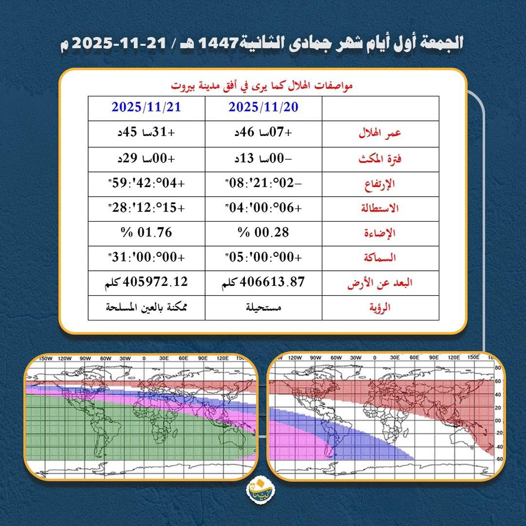 وكما يلاحظ في الصورة المرفقة فإن الرؤية مساء الخميس (ليلة الجمعة) ممكنة بالعين المجردة بشرط صفاء الجو وخبرة الراصد كما في القسم الجنوبي من أميركا الحنوبية ، وبالعين المسلحة كما في أغلب مناطق أميركا الجنوبية . فيكون اليوم الأوّل من شهر جمادى الثانية نهار الجمعة 21/11/2025 بالنسبة للمناطق التي تشترك بجزء من الليل مع مناطق الرؤية، ونهار السبت 22/11/2025 بالنسبة للمناطق التي لا تشترك معها بجزء من الليل . وذلك طبقاً للمبنى الفقهي لسماحة العلامة المرجع السيّد محمد حسين فضل الله (رض) والذي يرى أن الشهر يبدأ إذا أمكن رؤية الهلال في أي منطقة من العالم شرط أن نشترك معها بجزء من الليل.
