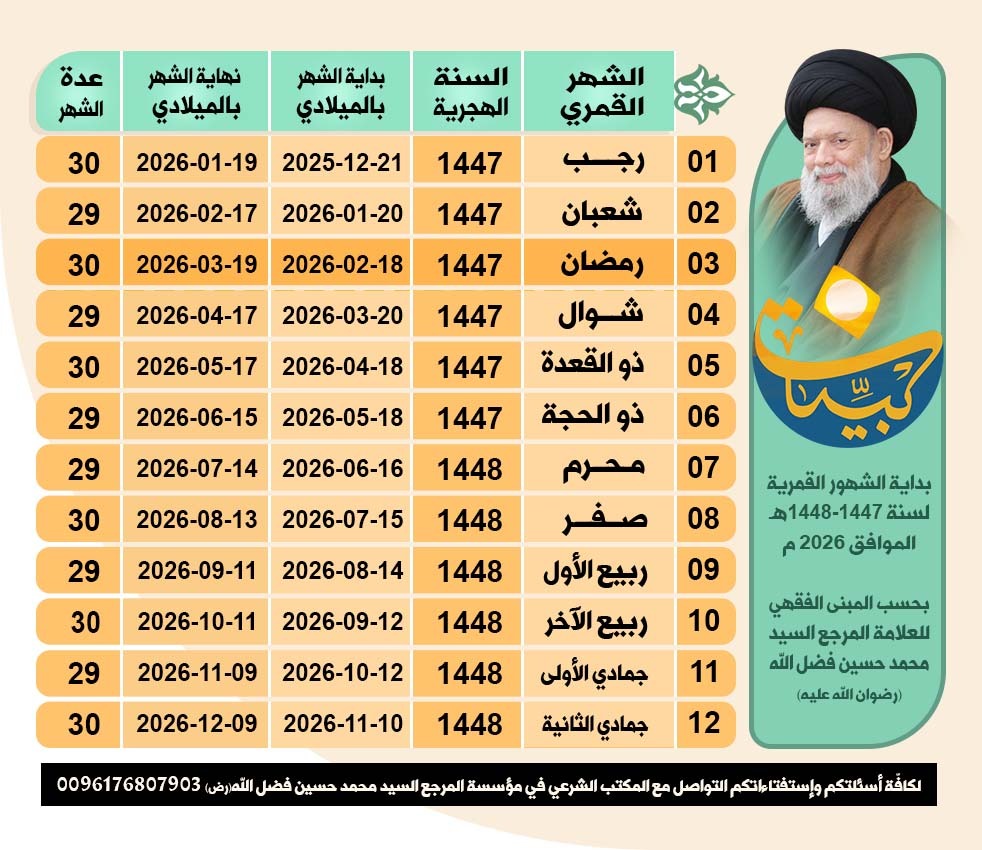 اصدرت المكتب الشرعي في مؤسسة العلامة المرجع السيد محمد حسين فضل الله(رض)، جدولا يحدد بدايات الشهور القمرية خلال العام الميلادي 2026 وذلك بحسب المبنى الفقهي لسماحة السيد المرجع فضل الله(رض).